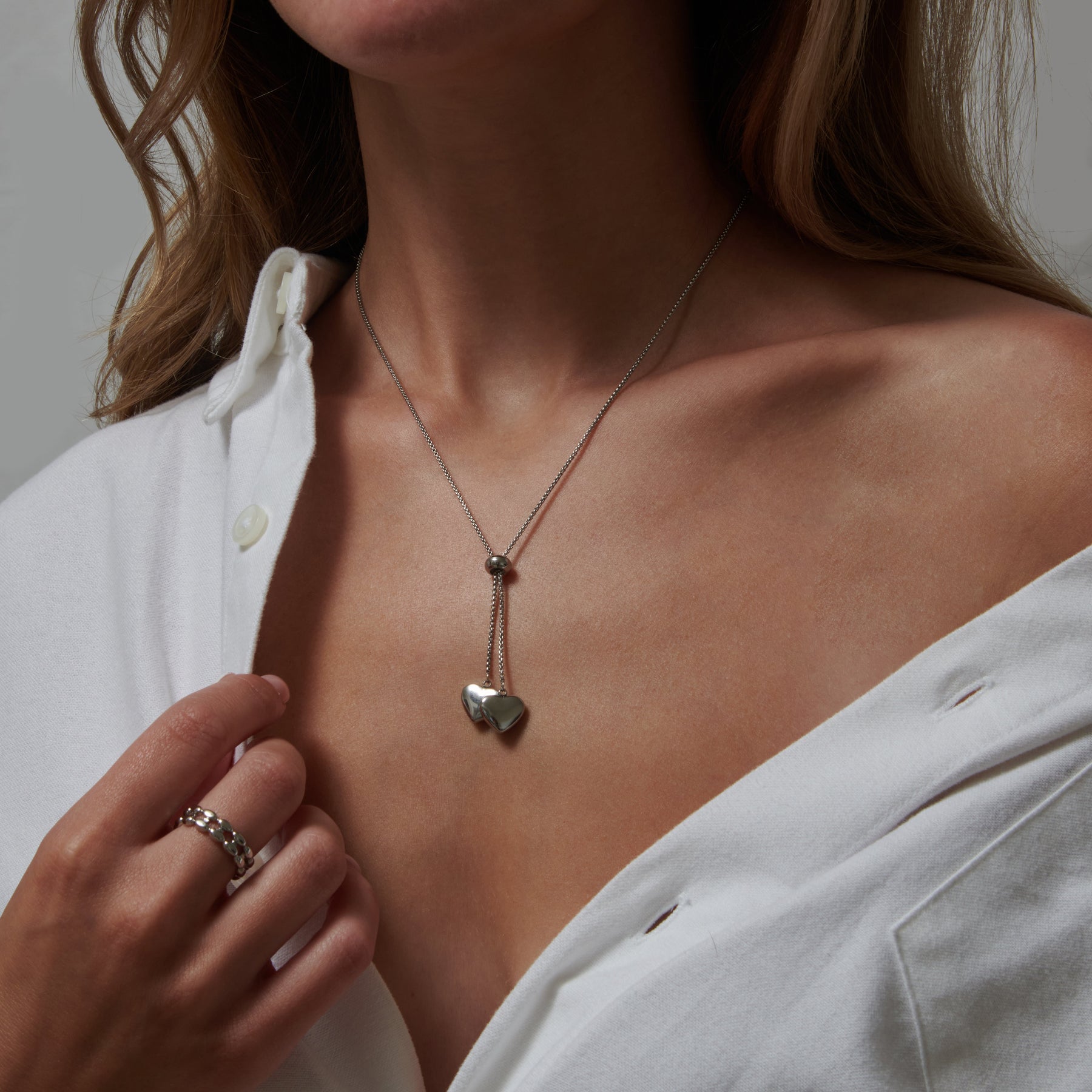 Tämä kaulakoru, jossa on kaksi toisiinsa kietoutunutta sydäntä, symboloi ikuisuutta rakkautta ja omistautumista. Sen roikkuva muotoilu lisää ainutlaatuisen ja leikkisän vivahteen mihin tahansa asusteeseen, mikä tekee siitä välttämättömän lisävarusteen todelliselle romantikolle.