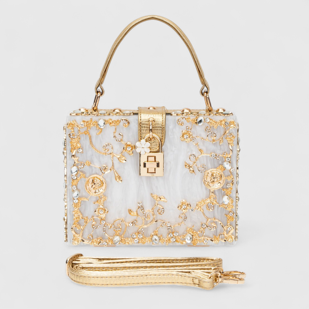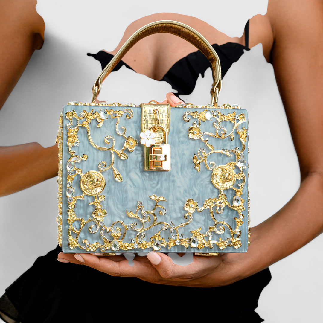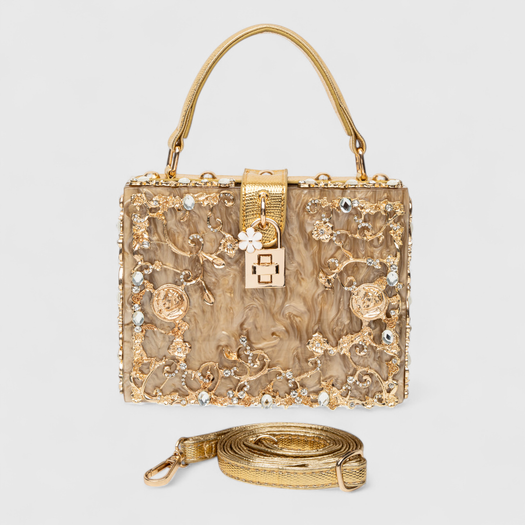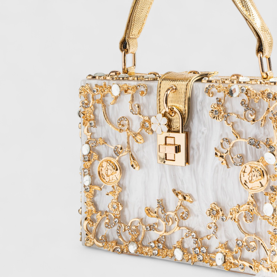Tutustu Acrylic Box Bag -laukun moderniin eleganssiin – täydellinen yhdistelmä luksusta ja innovatiivista muotoilua. Tämä laatikkomainen laukku on koristeltu ainutlaatuisilla kultaisilla kukkakuoseilla, jotka antavat sille naisellisen ja hienostuneen ilmeen.